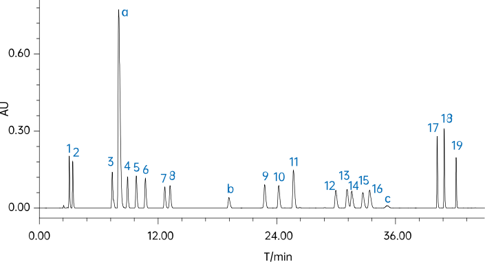 檢測(cè)物質(zhì):1.天門(mén)冬氨酸,2.谷氨酸,3.絲氨酸,4.精氨酸 ,5.甘氨酸,6.蘇氨酸,7.脯氨酸,8.丙氨酸,9.纈氨酸,10.甲硫氨酸,11.胱氨酸,12.異亮氨酸,13.亮氨酸,14.色氨酸 ,15.組氨酸,16.苯丙氨酸,17.半胱氨酸,18.賴氨酸,19.酪氨酸,a,b,c為衍生引入