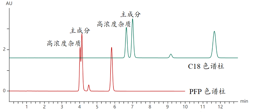 通過查詢結構可知,二者互為芳香族位置異構體,所以PFP柱是分離該類化合物的理想選擇。但實際結果中PFP柱的分離反而更差,這是什么原因?