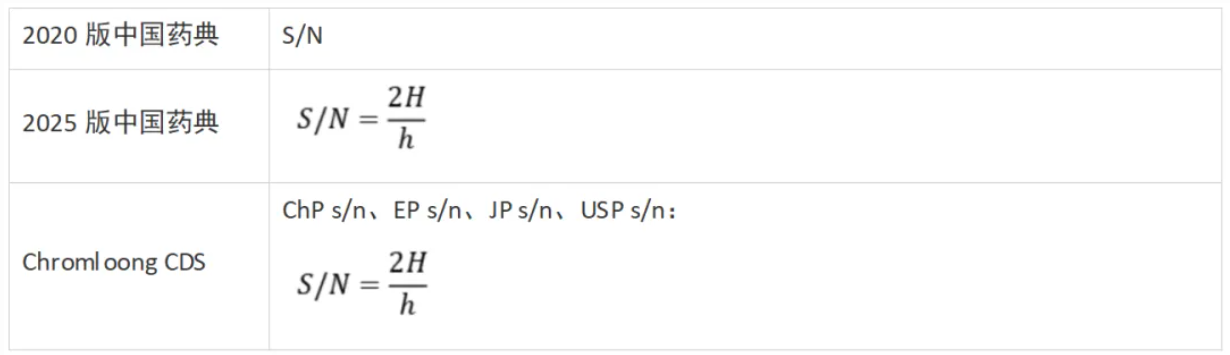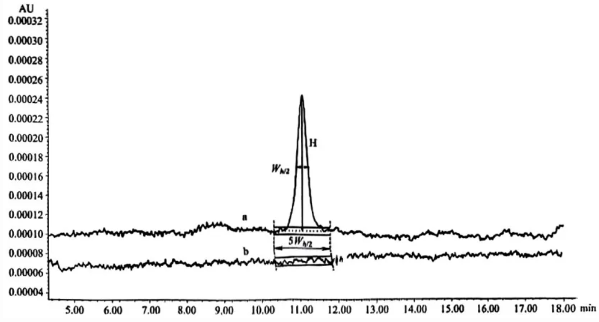 h 為使用空白溶液在參比溶液目標峰至少 5 倍半高峰寬范圍內觀察到的噪音幅度。