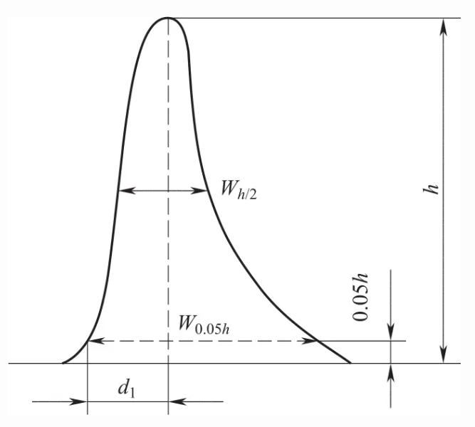 d1 為峰頂在 5% 峰高處橫坐標平行線的投影點至峰前沿與此平行線交點的距離。