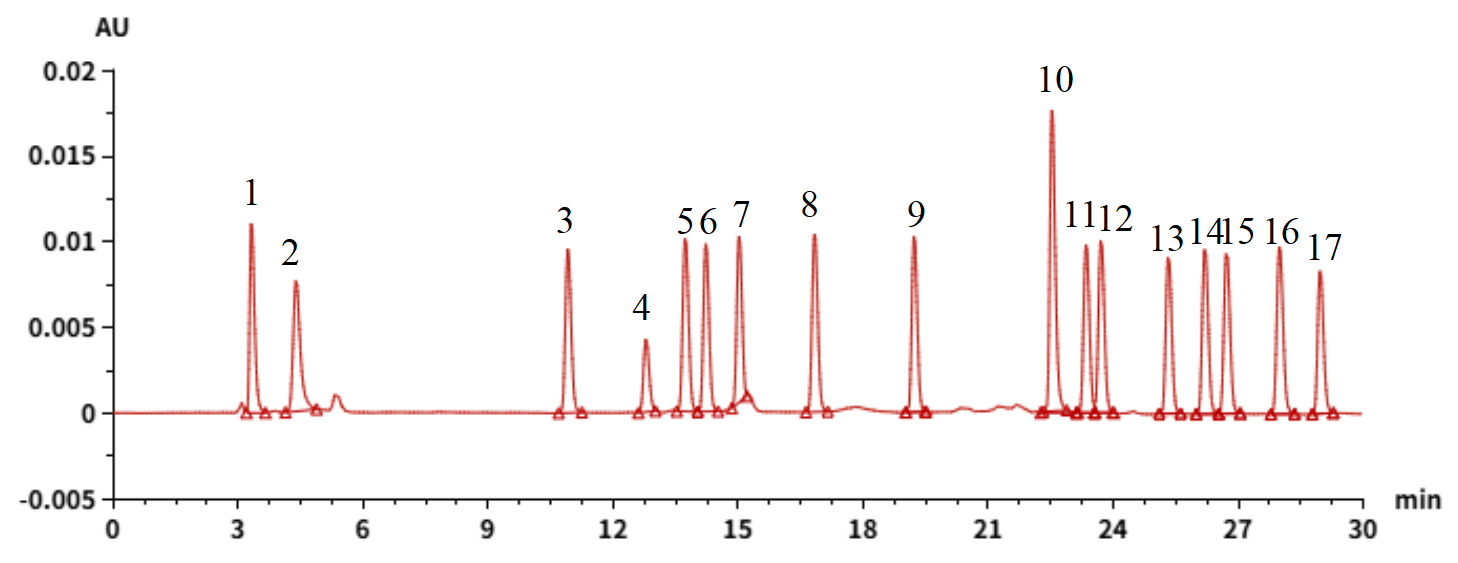 在線柱前衍生技術通過自動化設計,實現了更高的分析精度和效率。以氨基酸分析為例,華譜科儀高效液相色譜儀S6000,搭配AlphaHybrid C18, 4.6 × 250 mm, 5 μm分析色譜柱進行的氨基酸柱前自動在線衍生應用,可在40分鐘內完成18種氨基酸的分析。